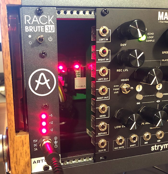 Il RackBrute, qui in versione 3U (ma disponibile anche in un formato più grande, il 6U) rappresenta un’ottima soluzione per chi volesse avvicinarsi al mondo modulare, ad un prezzo accessibile. Esso infatti è un “involucro” che può racchiudere diversi moduli, provvedendo a fornir loro la corretta alimentazione per il funzionamento (+12V, -12V e +5V) oltre che protezione per l’eventuale trasporto.