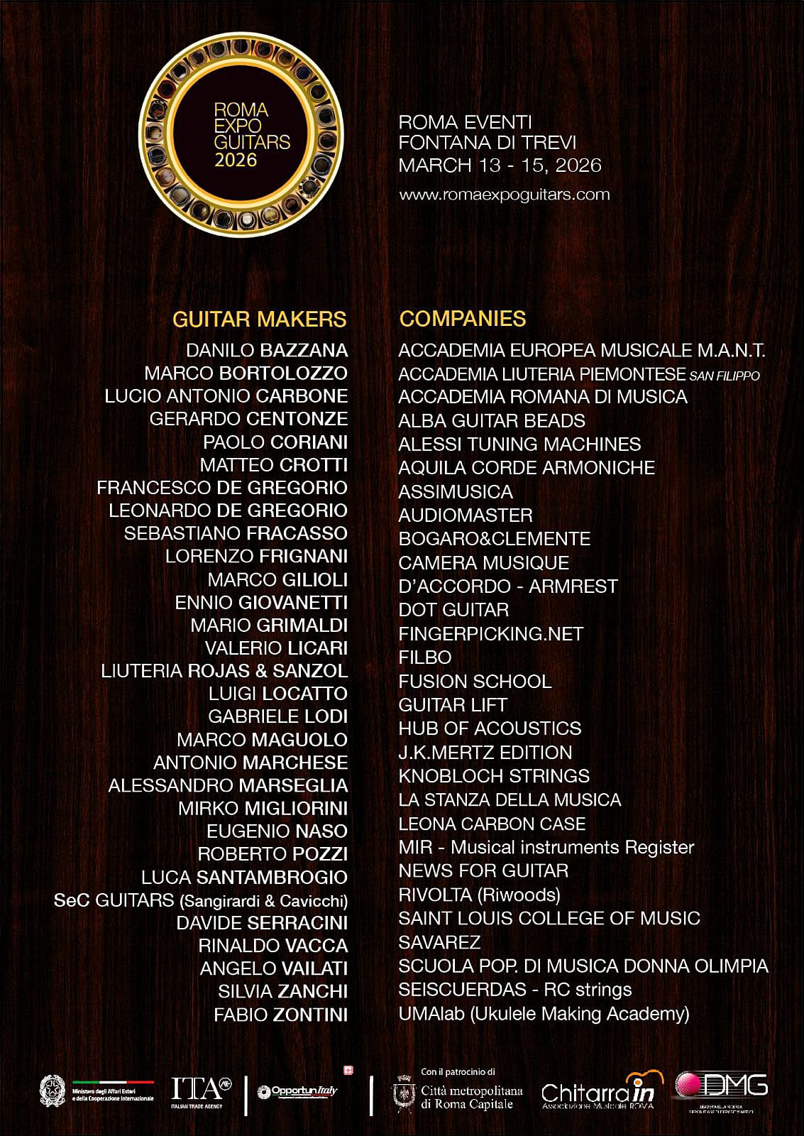 Alla Roma Eventi Fontana di Trevi, una magnifica Location di 1800 mq con 10 sale prova insonorizzate e un Auditorium dedicato, vi aspettano 30 liutai di chitarre classiche e 27 Aziende di settore (corde, custodie, meccaniche, amplificazione, legnami, editoria, accessori, ecc…)