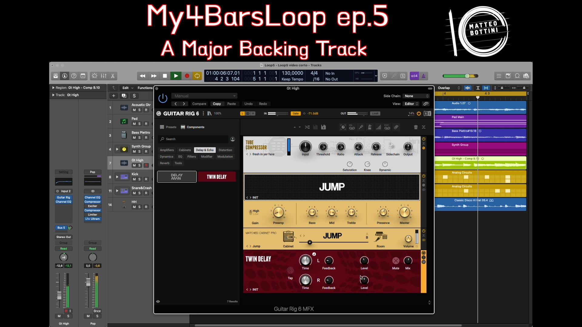 - Electric Guitar: con la Eko Tero ho suonato un riff che riprende il movimento della chitarra acustica, suonato a ottavi con note staccate con un delay a ottavo puntato che aggiunge quindi i sedicesimi che non vado a plettrare, come sappiamo soluzioni molto care a mostri sacri come Gilmour o The Edge.