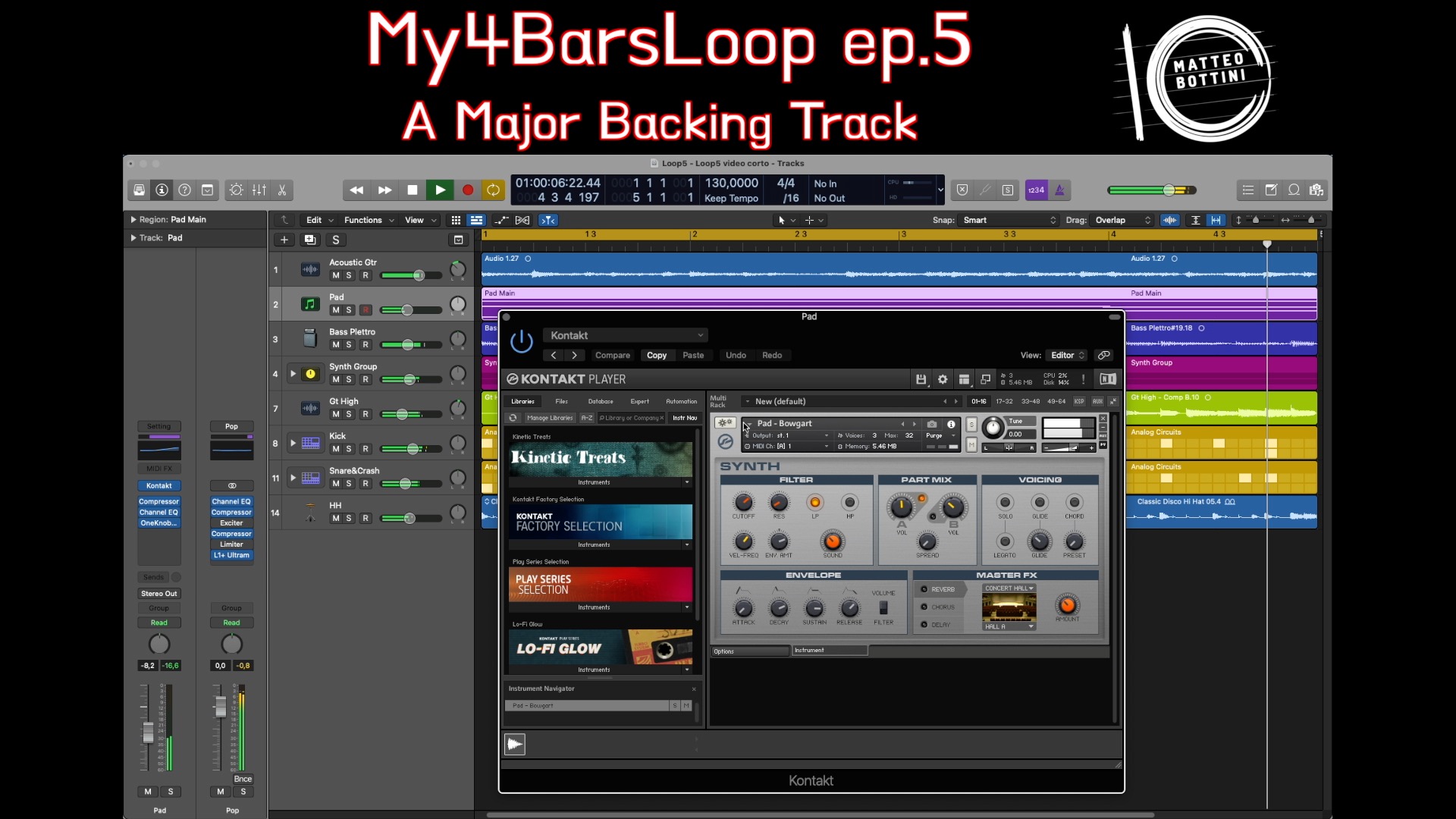 - Pad: un pad di Kontakt della library Factory Selection fa il suo lavoro di tappeto tenendo le note A E A per le prime tre battute poi l’accordo di E nella quarta, il tutto senza le terze, soprattutto nelle prime battute per lasciare libero il movimento delle voci della chitarra che si muovono.
