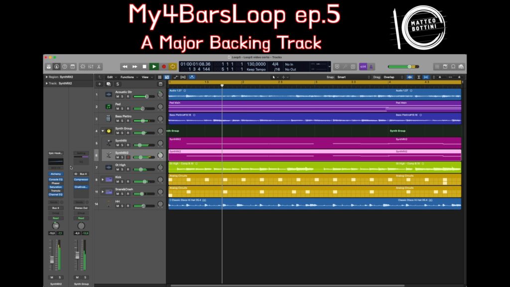 - Synth Group: un suono lead creato con il layering di due suoni, entrambi sintetizzatori di Logic (ES2 e Alchemy) che in maniera monofonica riprendono il movimento melodico delle chitarre.