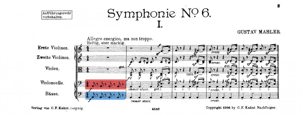La Sinfonia N°6 di Mahler, rappresenta qualcosa di mai tentato a livello strutturale da un compositore prima d’allora. Il primo movimento si apre con dei LA staccati di violoncelli e contrabbassi, supportati da rullate militaresche di tamburo ed un possente tema in LA minore che incede sul muro rappresentato dall’utilizzo di ben otto corni. Subito dopo, i timpani rincarano la dose con un ritmo simile a quello che si può ancora assaporare nelle parate di Alpini austriaci: Sinistra! Sinistra! Sinistra-destra-sinistra!