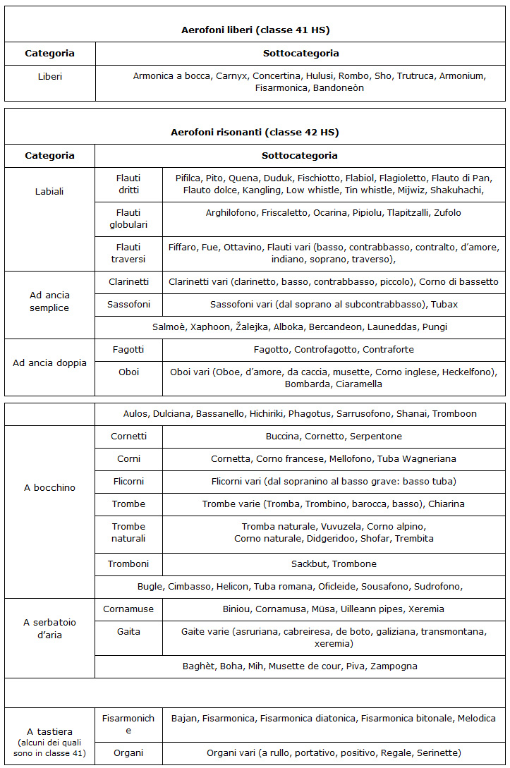 Nelle tabelle che seguono sono elencate categorie e sottocategorie principali degli aerofoni in relazione alla divisione in classi (liberi e risonanti). Come già fatto per i cordofoni vi ricordo che non troverete tutti gli strumenti ad aria esistenti.