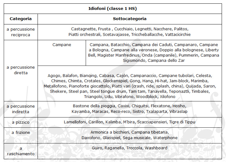 In base alla classificazione gli idiofoni si suddividono in sei famiglie fondamentali: