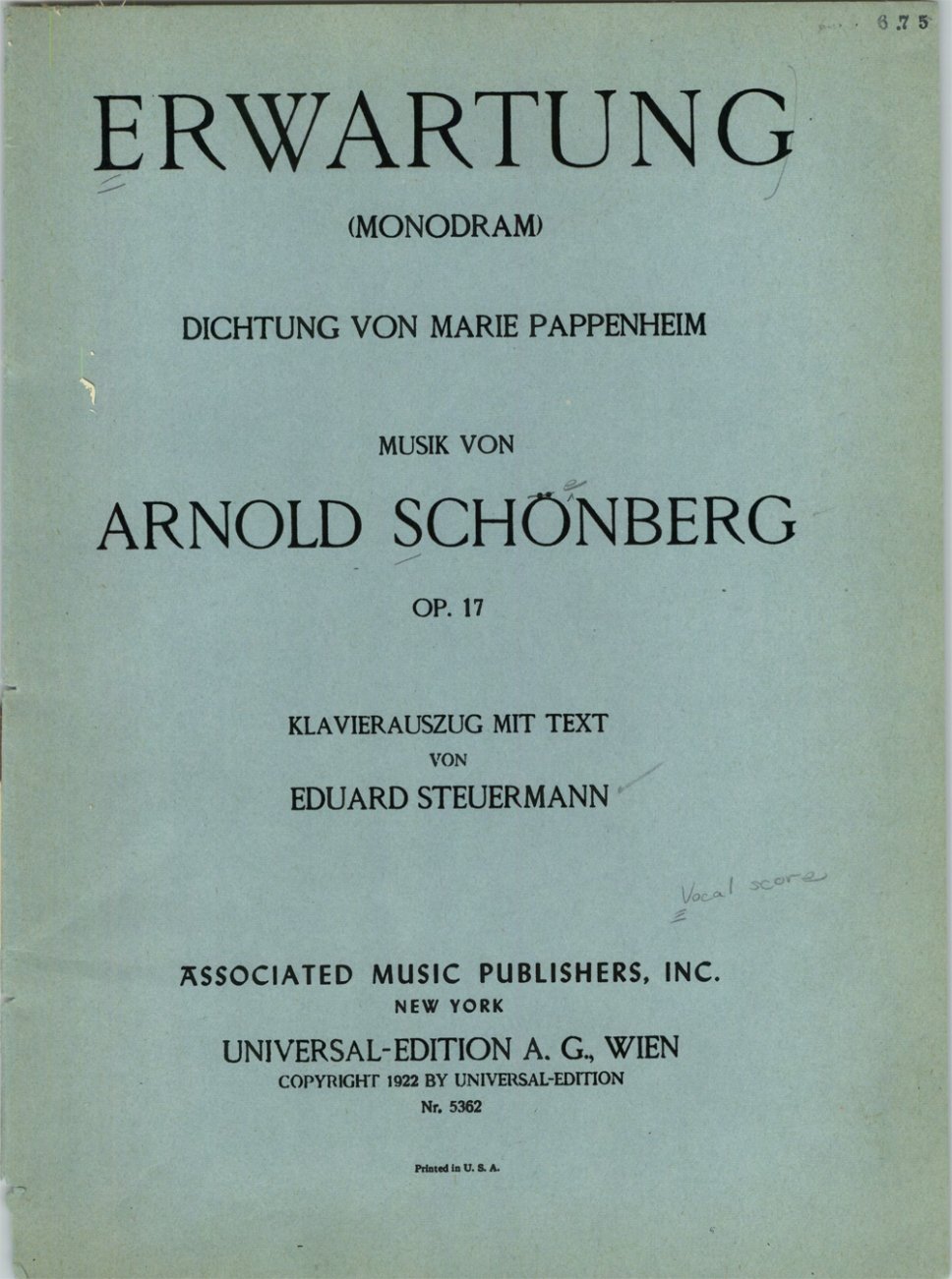 Un monodramma per soprano ed orchestra è l’Erwartung op. 17 (Attesa op. 17, del 1909) abbozzato in uno stato da macchina inconscia in soli 17 giorni: storia angosciosa di una frau (che sta per donna) claudicante in una pallida foresta alla ricerca ansiosa dell’amante perduto e ritrovato cadavere in una Natura ostile all’uomo, contrappuntata da polifemici accordi dalle otto alle dieci note. L’epifania dell’abisso silenzioso illogico ed indistinto è dietro quello slancio vocalico dal SI al DO diesis che sfocia con l’intonare «Aiuto», citazione dal Parsifal wagneriano.