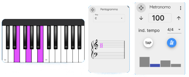 App “Pianoforte” (in modalità tasti luminosi e non) +App “Pentagramma” + App metronomo