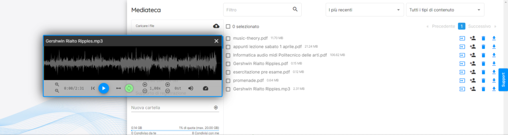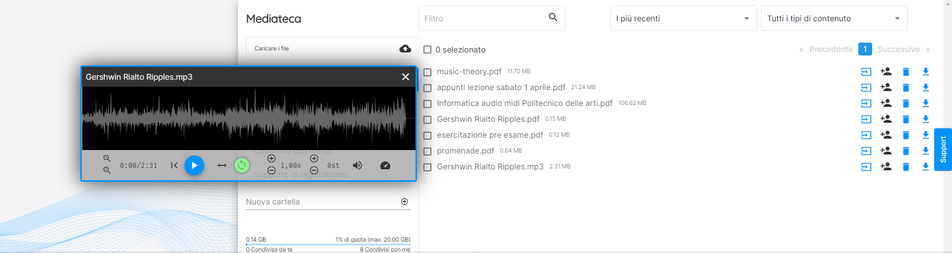 Attraverso la Mediateca potrai caricare spartiti, brani audio (backing track o song), fare musica d’insieme senza ricorrere ad applicazioni esterne. Il lettore audio della media library ti permetterà di rallentare o accelerare il brano durante lo studio, mettere in loop un passaggio particolarmente complesso e, se necessario cambiare la tonalità del brano stesso in tempo reale.