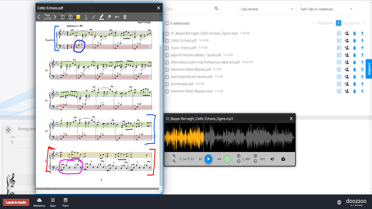 Potrai caricare i tuoi spartiti con la possibilità di scrivere appunti per favorire l’apprendimento del brano e della sua struttura. Oppure sarà altrettanto facile aprire alcuni pentagrammi vuoti e, attraverso la penna della tua digital board, scrivere strutture, temi, esercizi ecc.