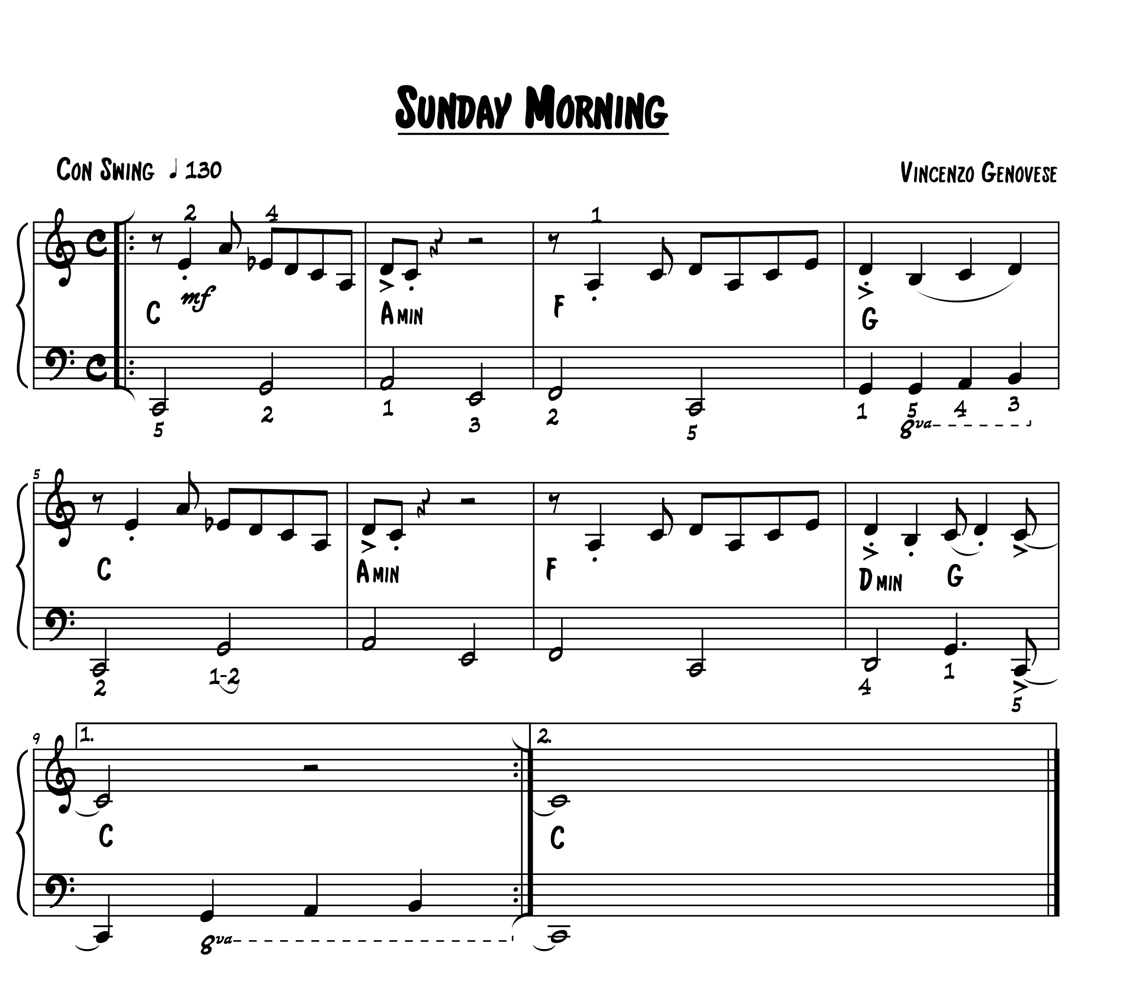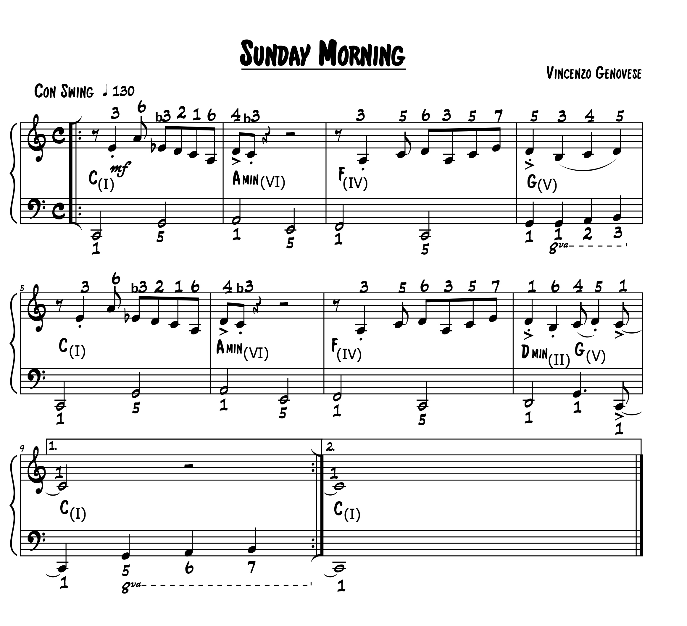 Ma dopo questa necessaria premessa, andiamo agli aspetti pratici, che spero ti aiuteranno. Ti propongo una mia piccola composizione didattica, prova a suonarla bene. I numeri che troverai accanto ad alcune note, sono riferiti alla diteggiatura che consiglio di utilizzare per una migliore esecuzione.
