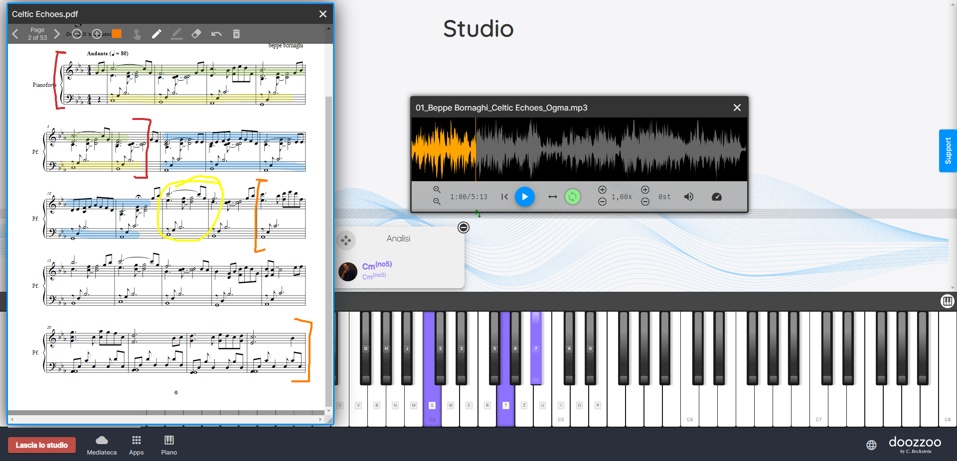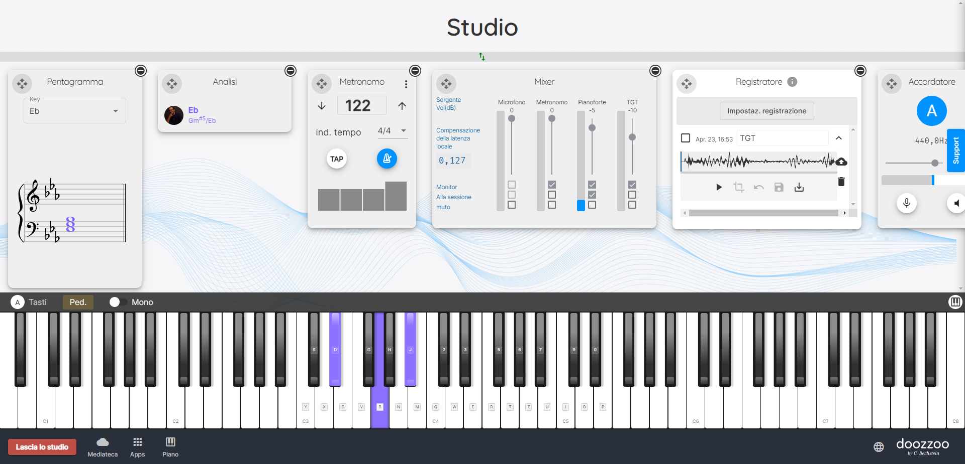 doozzoo in classe, su una digital board, su una lim o sul tuo computer, per le lezioni di musica collettive o individuali, vuole aprire una nuova frontiera basata sulla facilità di utilizzo di uno strumento all-in-one dove tutto è a portata di mano: metronomo, accordatore, registratore audio e video, player audio e video con speed control e pitch control, visualizzatore di pdf e formati fotografici, cloud per la costruzione e l’archivio delle tue lezioni, pianoforte stereofonico con protocollo midi, applicazione per l’analisi e la visualizzazione delle sigle degli accordi suonati, pentagramma a doppia chiave con impostazione della tonalità ecc..