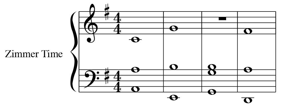 Questo tipo di movimento armonico è un movimento di 4° ascendente e questo crea un iniziale senso di smarrimento della tonica, essendo il brano in Em, e la disposizione delle voci ideate da Zimmer crea un movimento ancora più “smarrito” (l’ideale per il tipo di film) avendo un movimento alternato tra parte stretta e parte lata :