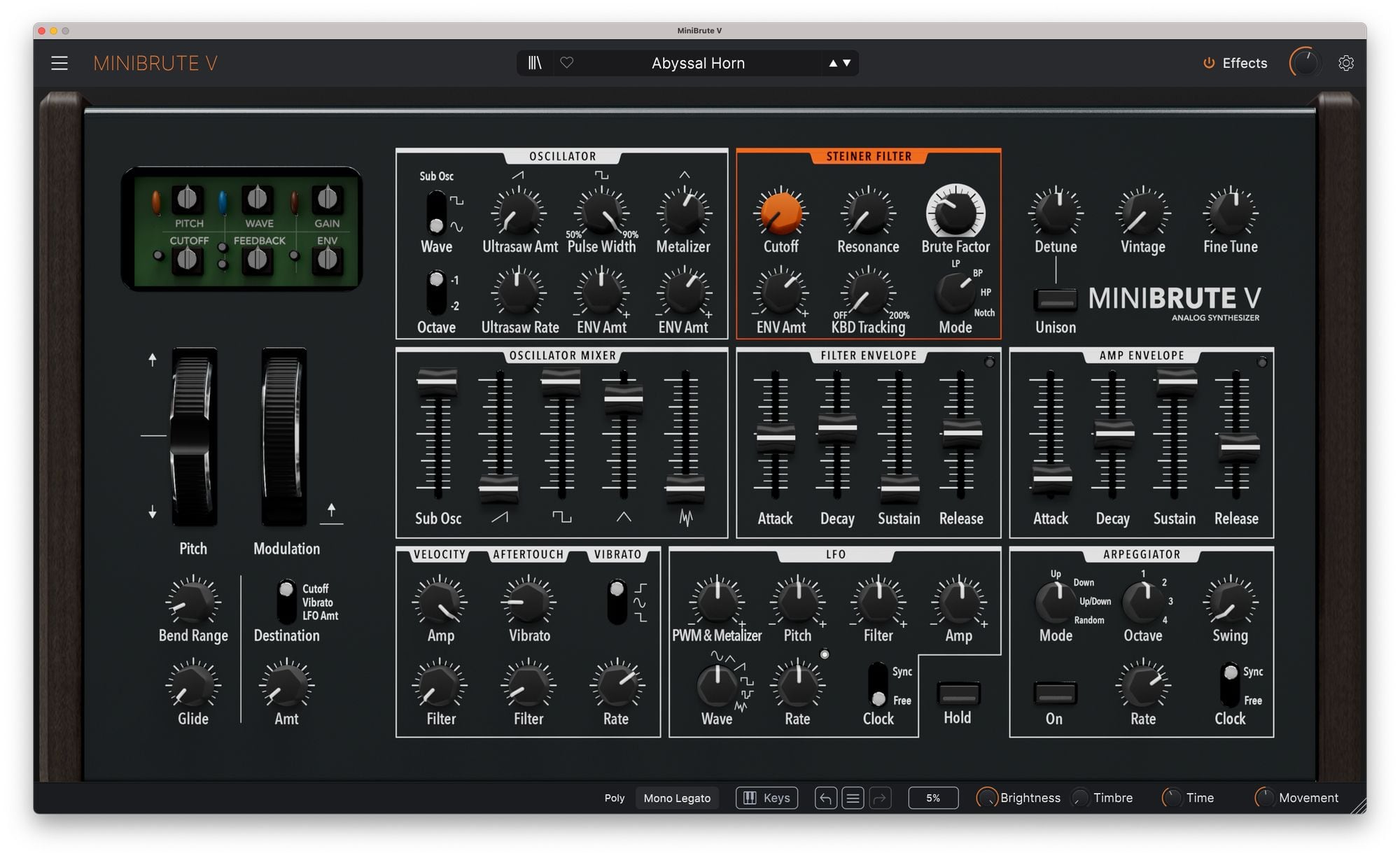 Il MiniBrute V mantiene il cuore sonoro del suo predecessore, ma introduce significative migliorie. Può operare come sintetizzatore polifonico a otto voci, pur offrendo una modalità monofonica per ricreare i suoni classici.