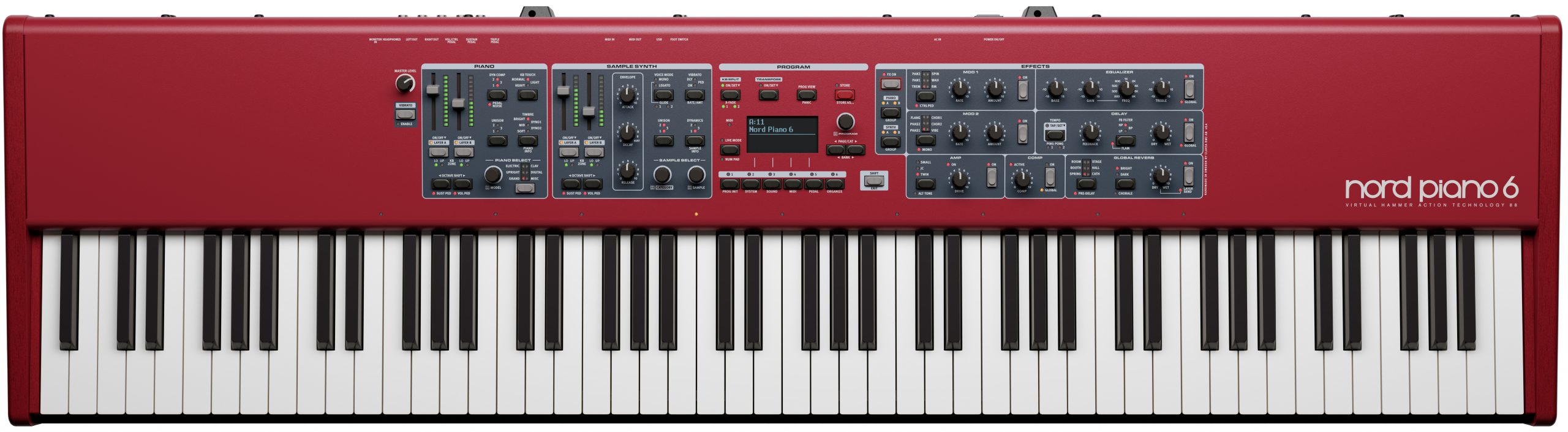 Il Nord Piano 6 è disponibile in due versioni: il modello a 73 tasti e quello a 88 tasti, entrambi dotati di una tastiera Triple Sensor con meccanica pesata per un feeling più vicino a un pianoforte acustico.