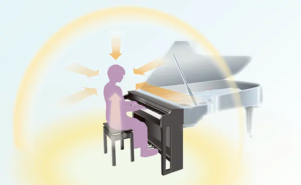 Yamaha ha bilanciato e posizionato in modo ottimale gli altoparlanti (divisi per bassi, medi e alti) per mantenere la centralità sonora del piano e allo stesso tempo favorire la suddetta diffusione, in modo che ogni suono emesso dagli altoparlanti suoni come se fosse stato emesso nel corretto punto di un pianoforte a coda reale.