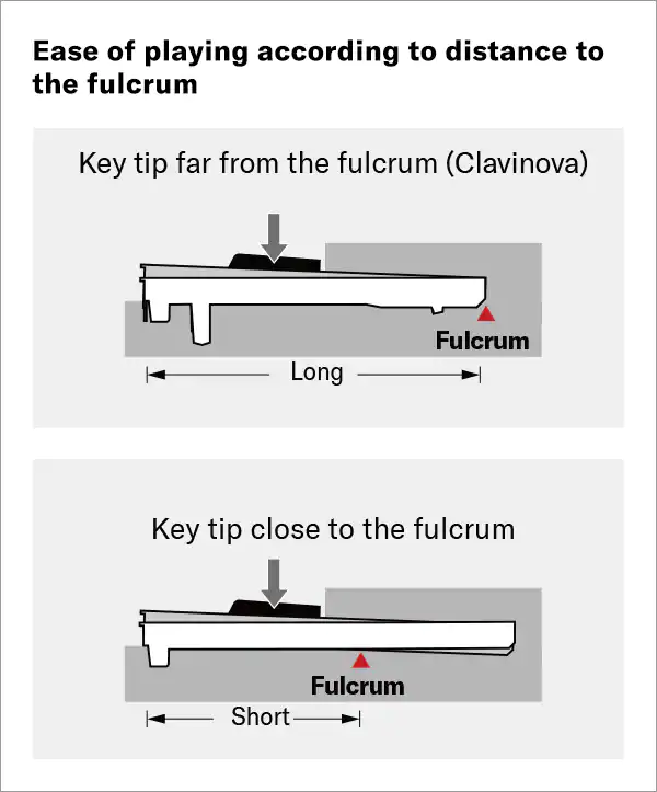 Parlando più in specifico dei tasti, la loro parte posteriore in un coda si trova più vicino al fulcro della meccanica, il che richiede una forza maggiore in quanto essendo più vicini al perno minore è la leva che si viene a creare (Archimede la sapeva lunga, NdR).