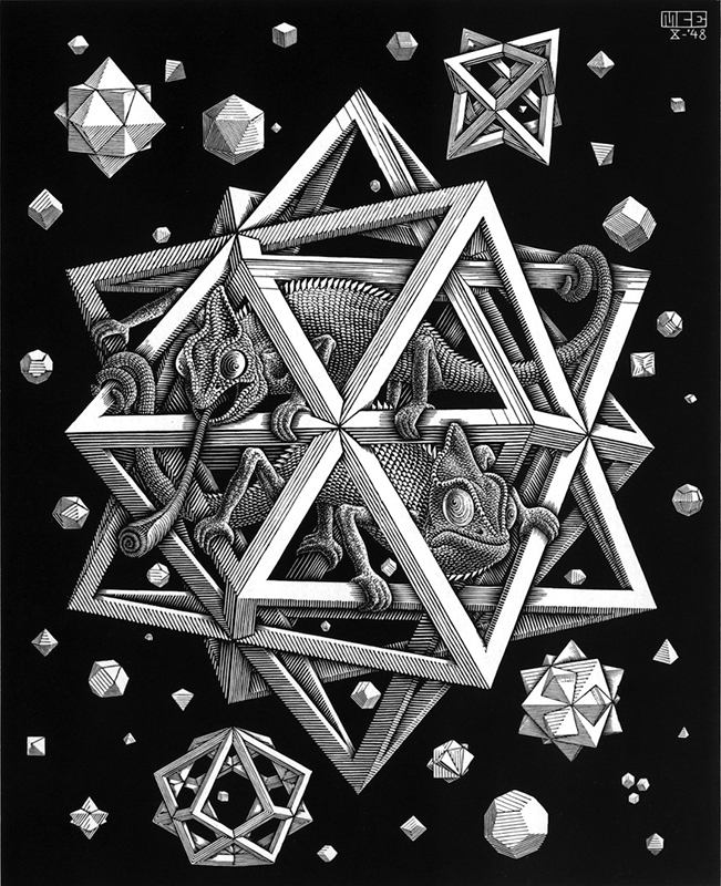 "Stelle" di Maurits Cornelis Escher, con il suo uso di Solidi Platonici e del “De divina proportione” di Fra Luca Pacioli