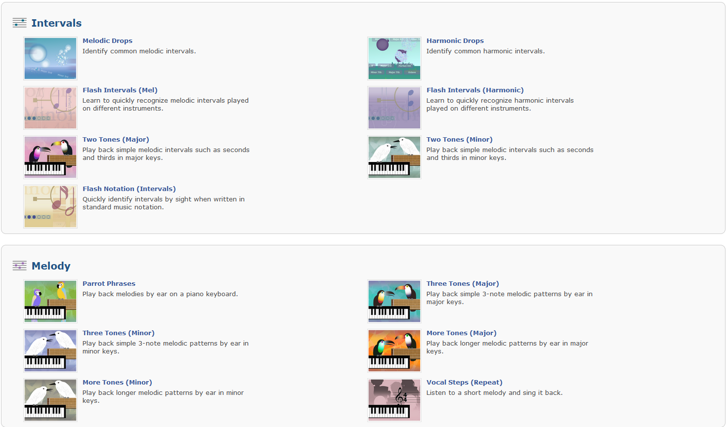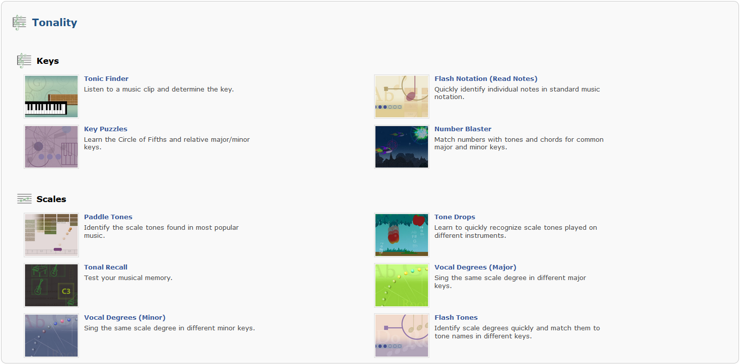 Theta Music Trainer presenta una vasta collezione di giochi suddivisi in diverse macro aree, tra cui Sound, Pitch, Rhythm, Tonality, Scales, Intervals, Melody e Harmony. Ogni gioco è stato appositamente progettato per essere didatticamente valido e offre una grafica accattivante che coinvolge gli utenti fin dal primo istante.